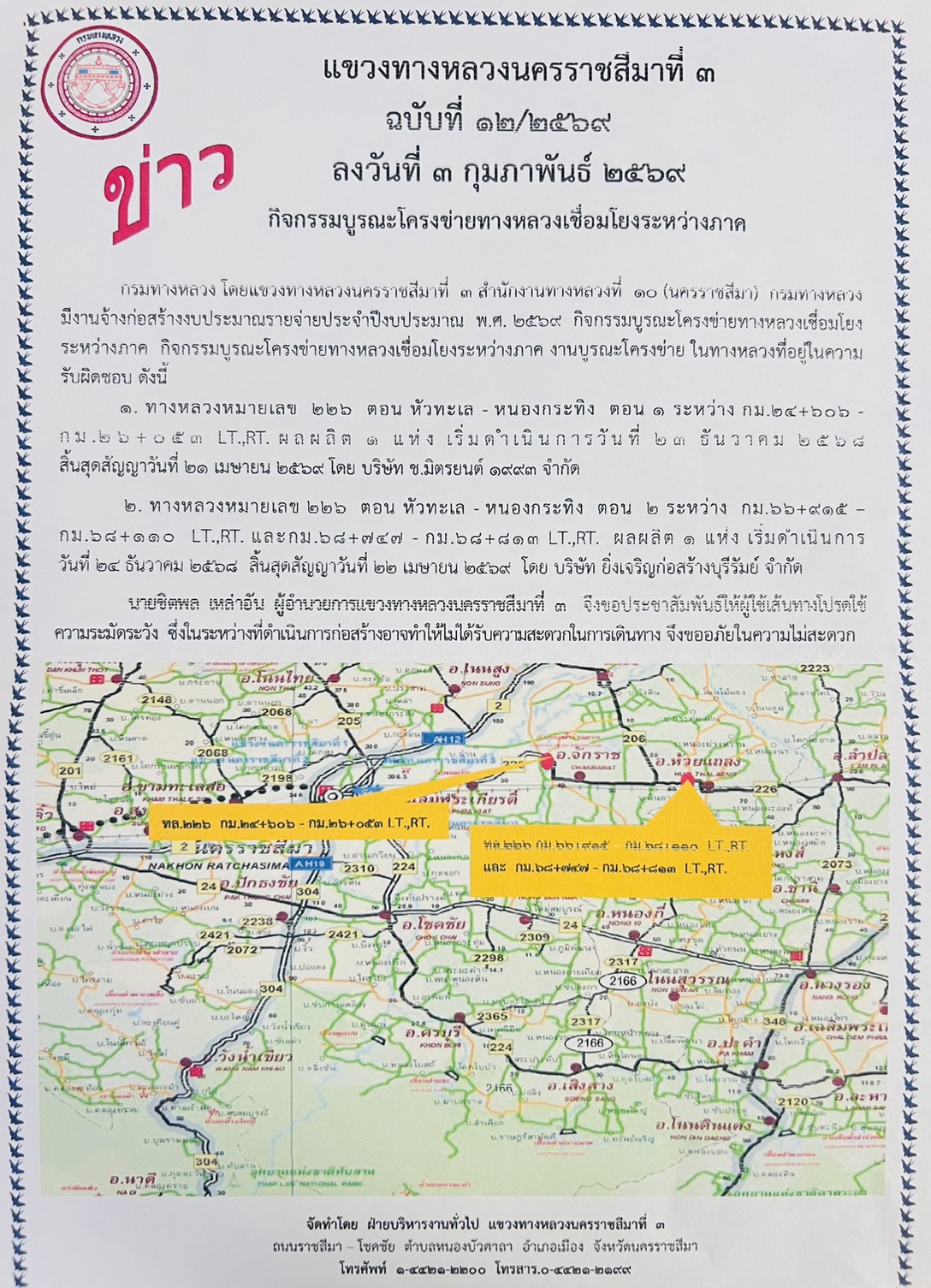 องค์การบริหารส่วนตำบลทองหลาง ขอประชาสัมพันธ์ข่าวแขวงทางหลวงนครราชสีมาที่ 3 หน่วยงานในพื้นที่ ประชาชนและผู้ใช้เส้นทางทราบ ในระหว่างที่ดำเนินการก่อสร้างอาจทำให้ไม่ได้รับความสะดวกในการเดินทาง ขอให้ผู้ใช้เส้นทางโปรดใช้ความระมัดระวังและขออภัยในความไม่สะดวก |