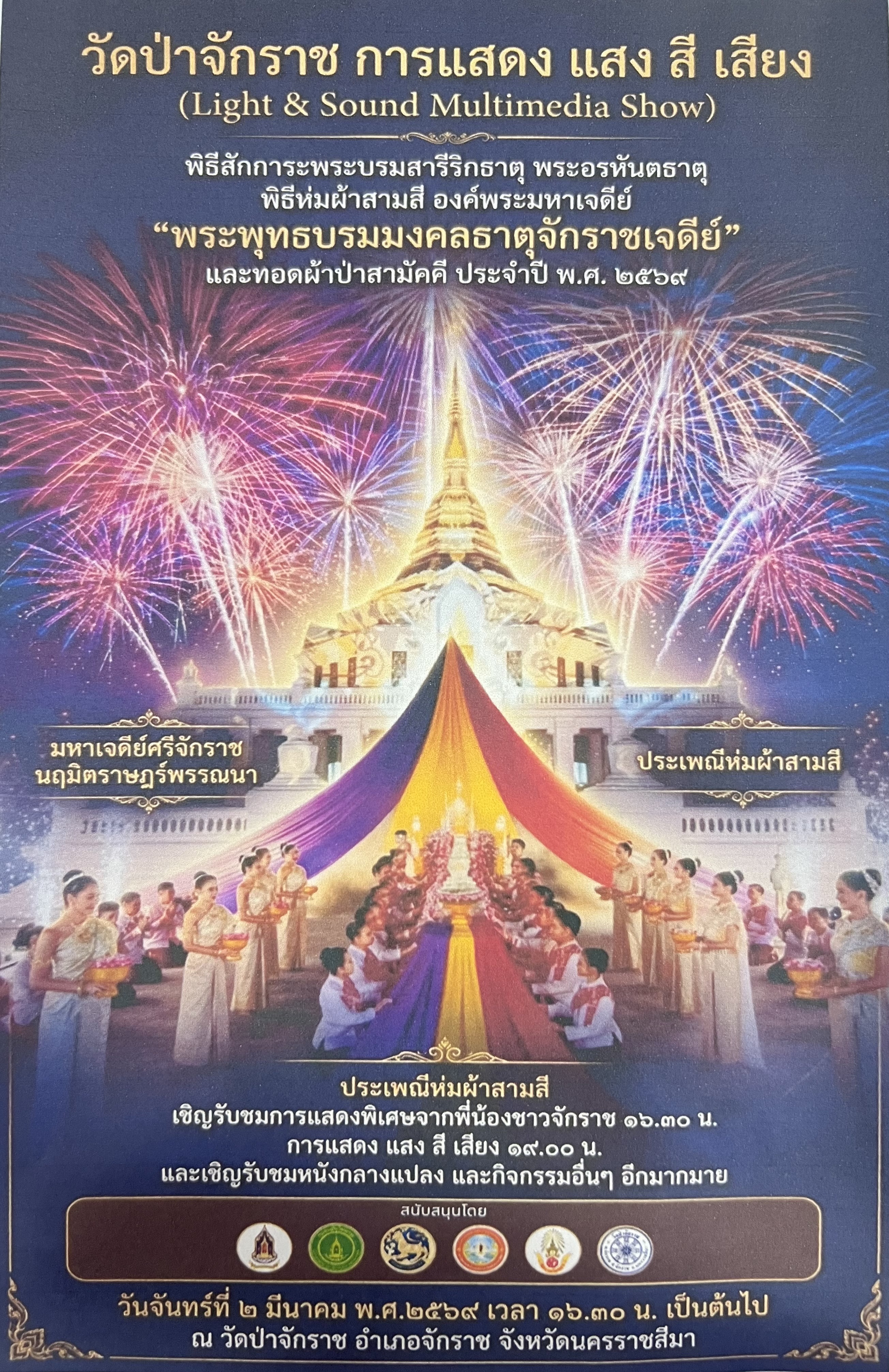 องค์การบริหารส่วนตำบลทองหลาง ขอเชิญร่วมพิธีสักการะพระบรมสารีริกธาตุ พระอรหันตธาตุ พิธีห่มผ้าสามสี องค์พระมหาเจดีย์ "พระพุทธบรมมงคลธาตุจักราชเจดีย์" ในวันจันทร์ที่ 2 มีนาคม พ.ศ.2569 เวลา 16.30 น. เป็นต้นไป ณ วัดป่าจักราช อำเภอจักราช จังหวัดนครราชสีมา |